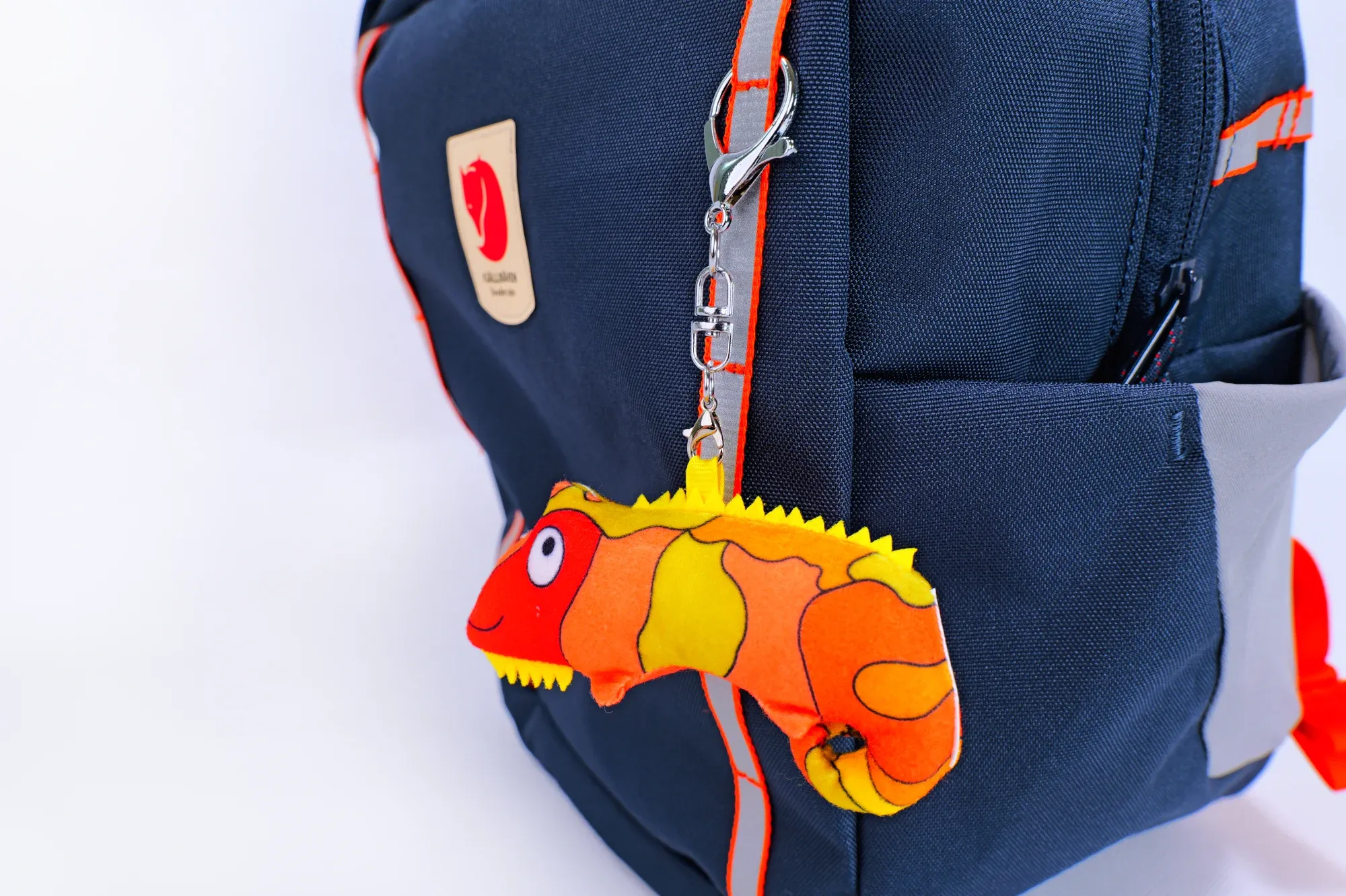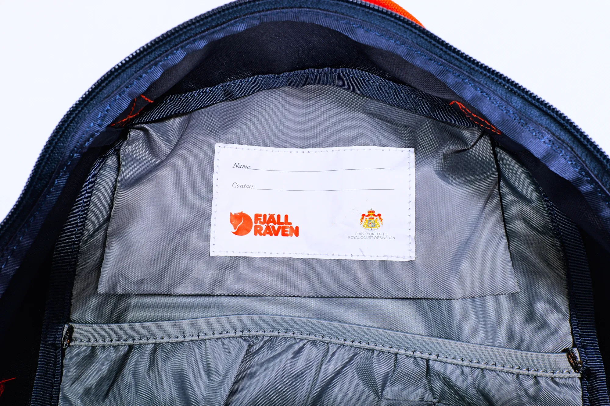The high-contrast orange Fjällräven logo on the tag makes it immediately identifiable when the bag is opened, helping children quickly recognize their own belongings among similar items.