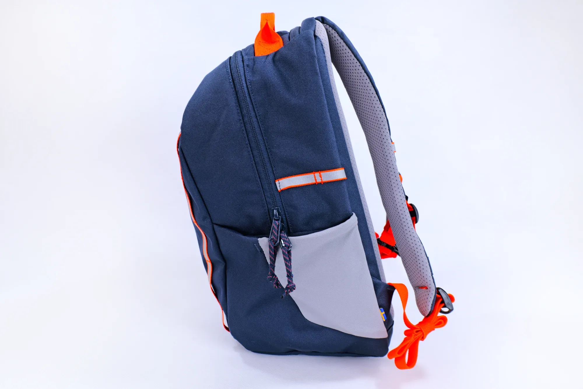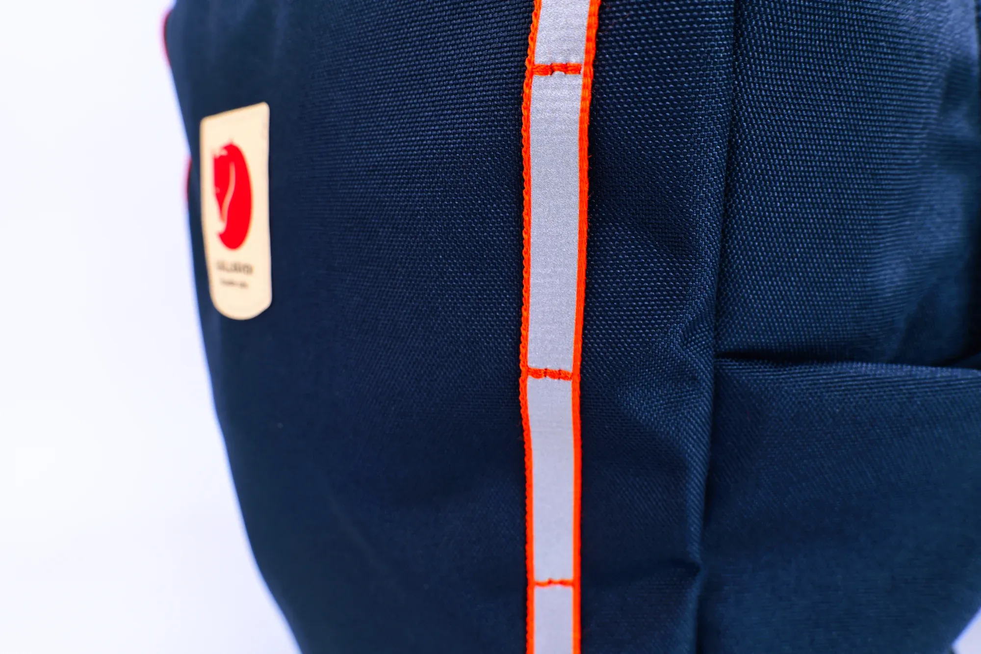 The Skule's design incorporates several practical features specifically designed for younger users. The navy blue fabric includes strategically placed nylon webbing loops with reflective strips that serve as attachment points. While these reflective elements add some visibility during low light conditions, their relatively small size means they aren't easily spotted from a distance. Consider these loops as a supplementary safety feature rather than a primary visibility solution.